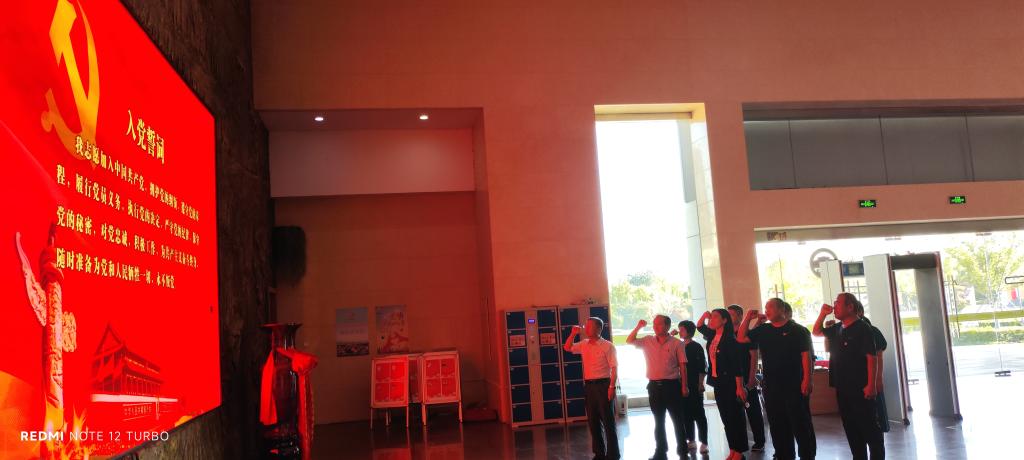 全体党员聚集在纪念馆主题雕塑前,面对党旗重温了入党誓词。
